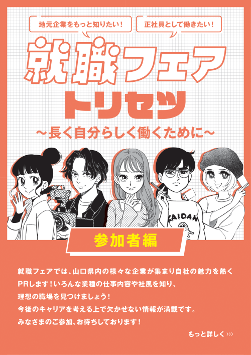 参加企業を、開催の約2週間前から当サイトにて公開予定です。事前に興味のある企業数社をピックアップして、「やまぐちジョブナビ」、各企業のHP等から情報収集や整理をしておくと、効率よく企業訪問できます。